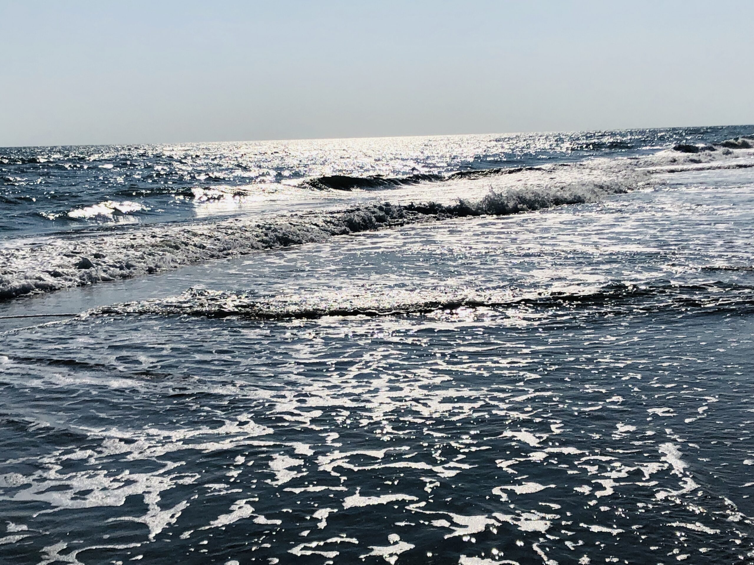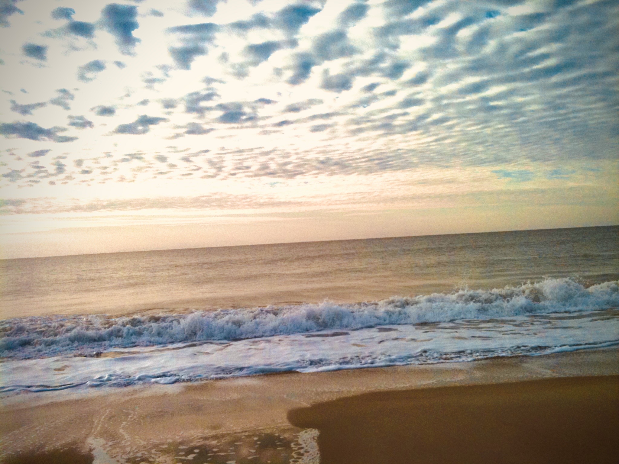 Gentle ocean waves meeting the sandy shoreline beneath a patterned coastal sky.