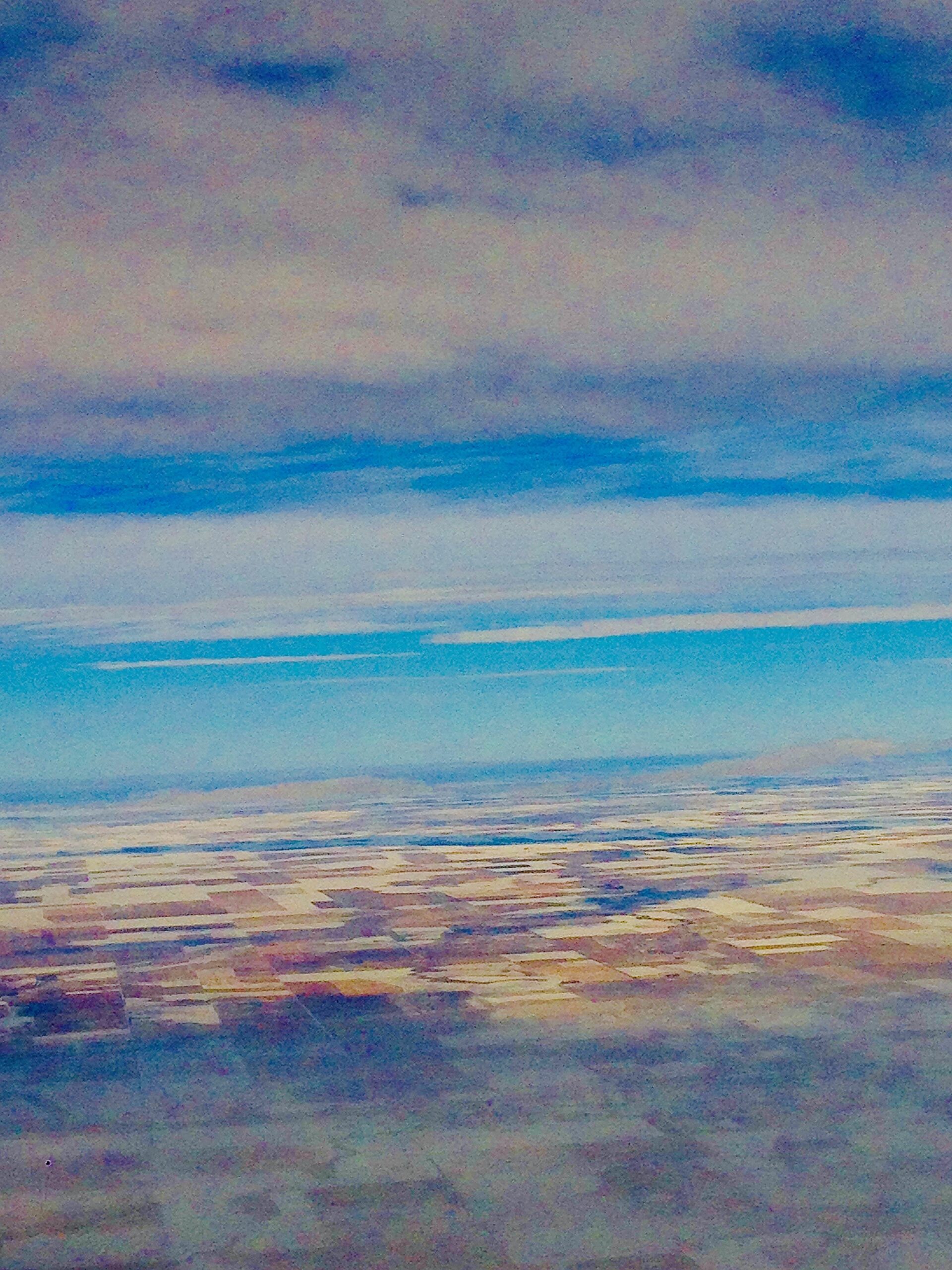 A wide coastal horizon beneath a clear blue sky and drifting white clouds.
